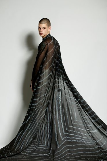 His suit was a variation of the one he'd worn during his network appearance. Leather this time, with a long coat that teased against his ankles whenever he deigned to move about the room. The shining veins of ruby were gone, but there was a sash now, like a bloody smear across his chest.